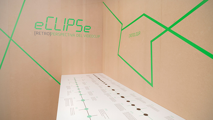 Identity for "eCLIPSe. Retroperspectiva del Videoclip" exhibition at Espacio Fundación Telefónica featuring a curated selection of music videos from 1975 to our present days by Carlos Navarro. Museography: Israel Sousa. Lima, Perú. 2013.